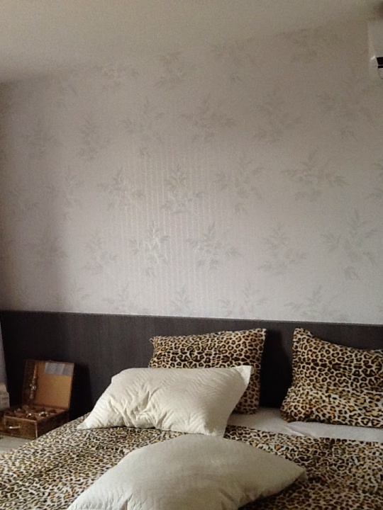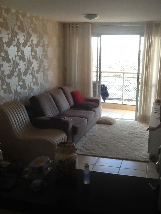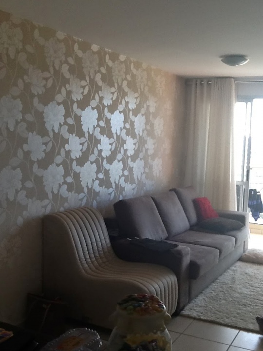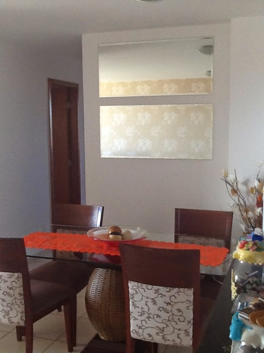 sala bem iluminada para dois ambientes,com papel de parede, detalhe em espelho, banheiro social com armário e box blindex, 01 cozinha com armário,